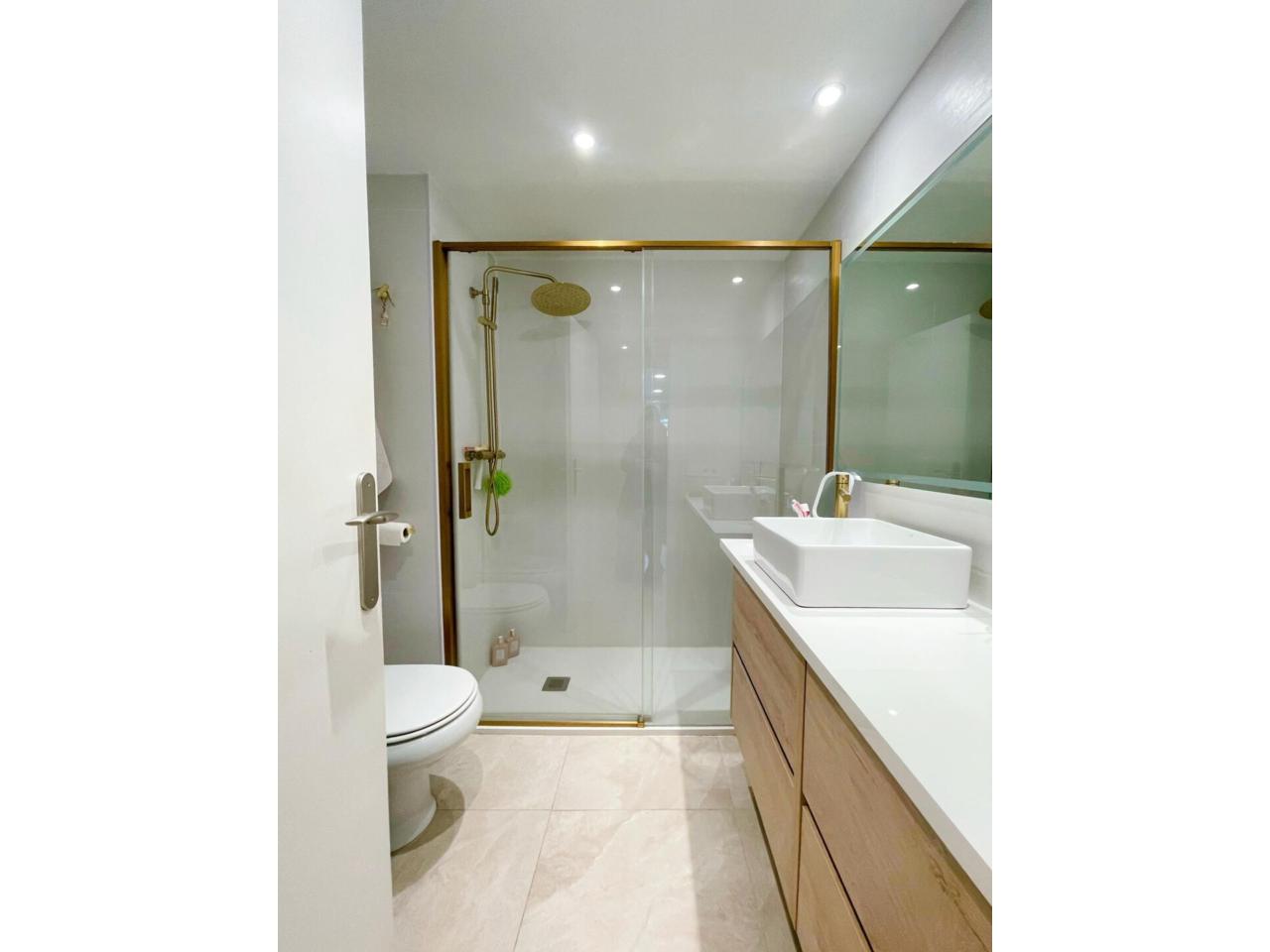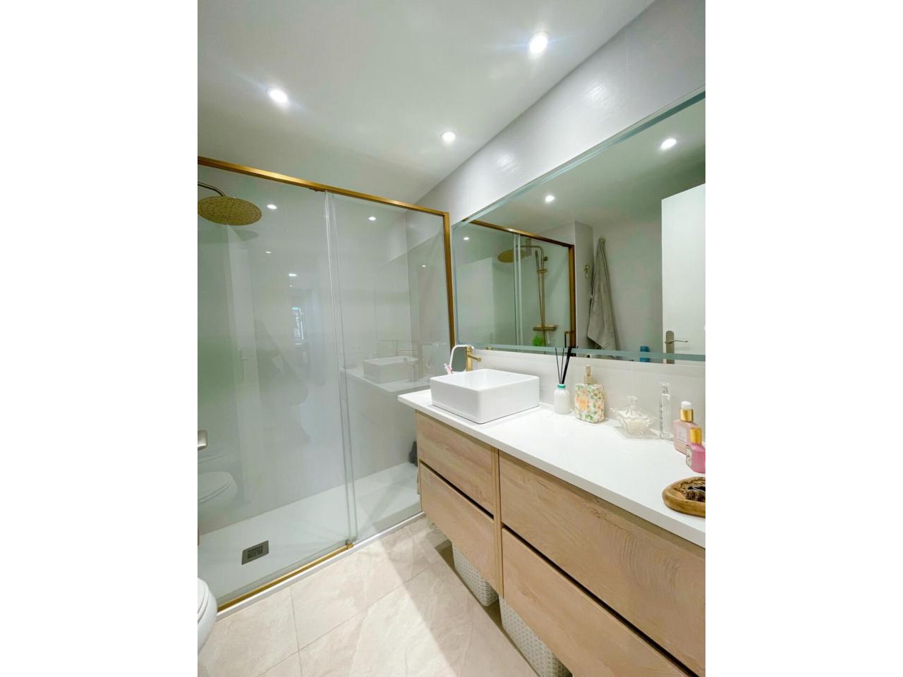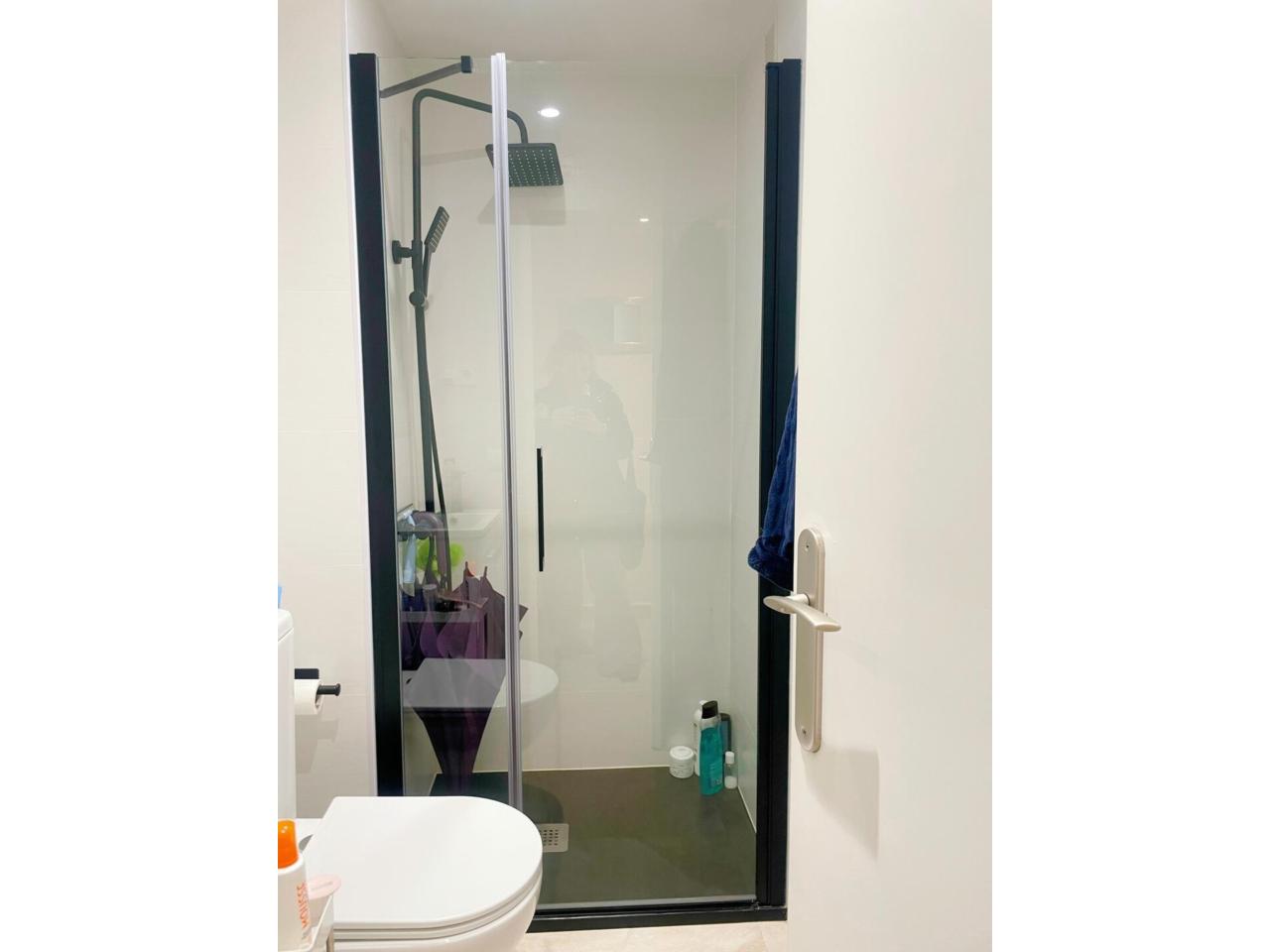 La vivienda dispone de dos baños completamente reformados. El primero de ellos dispone de 3 piezas, combinado unos tonos actuales entre el blanco y el negro y materiales naturales.