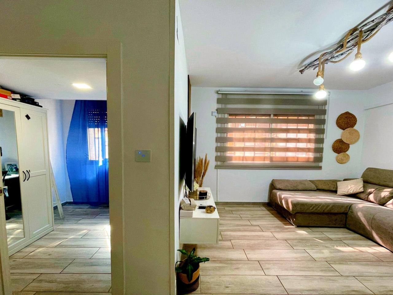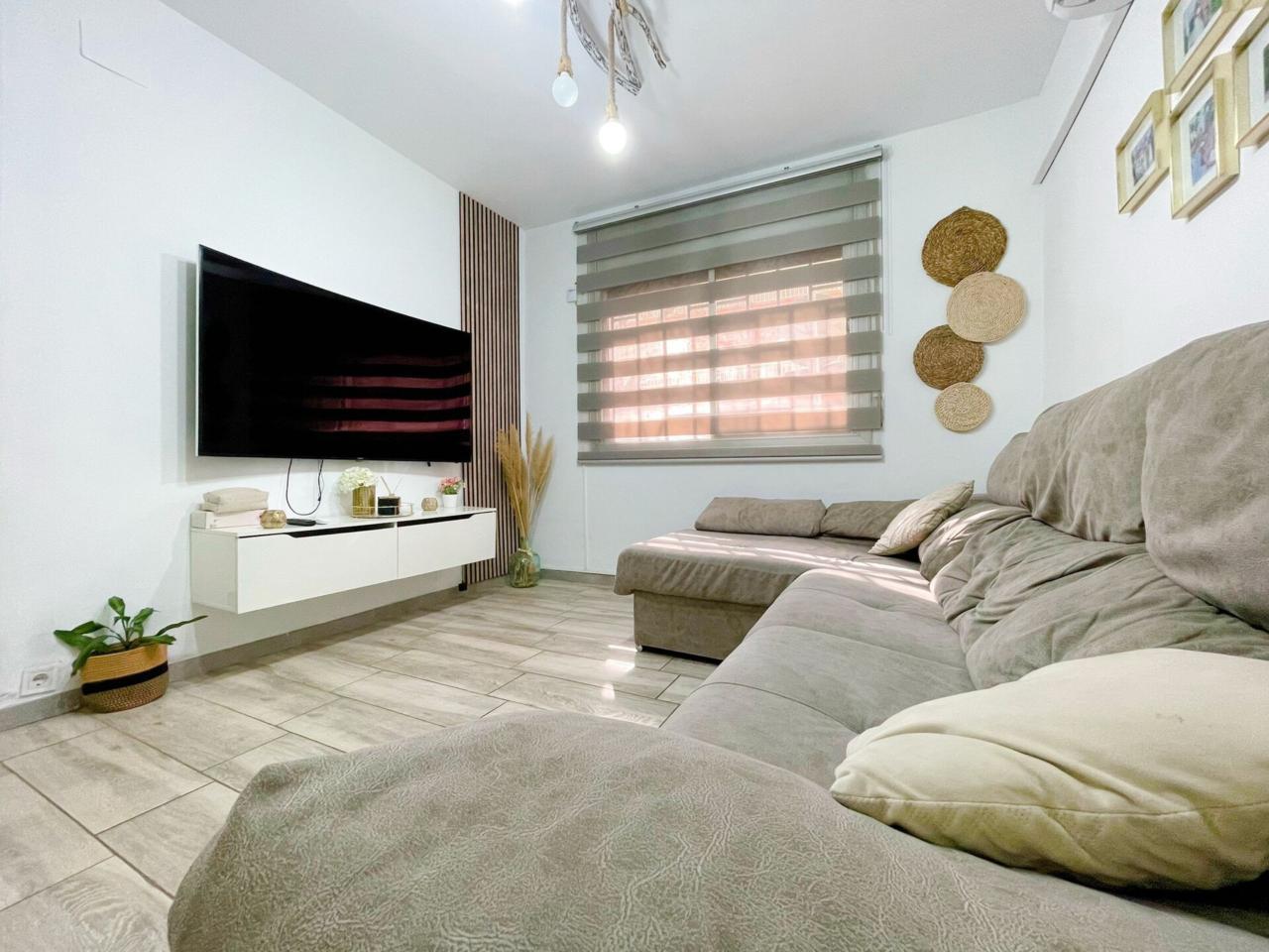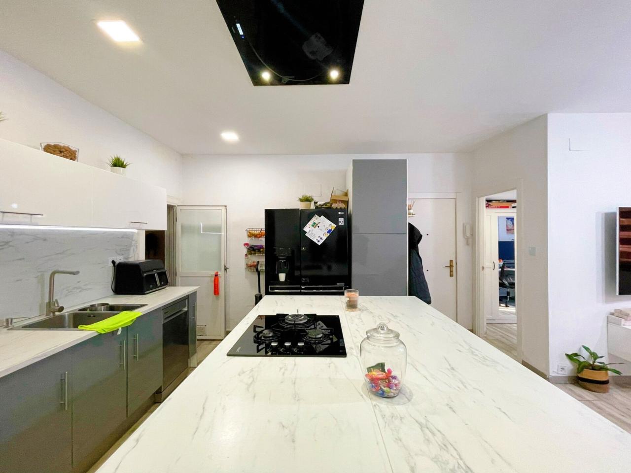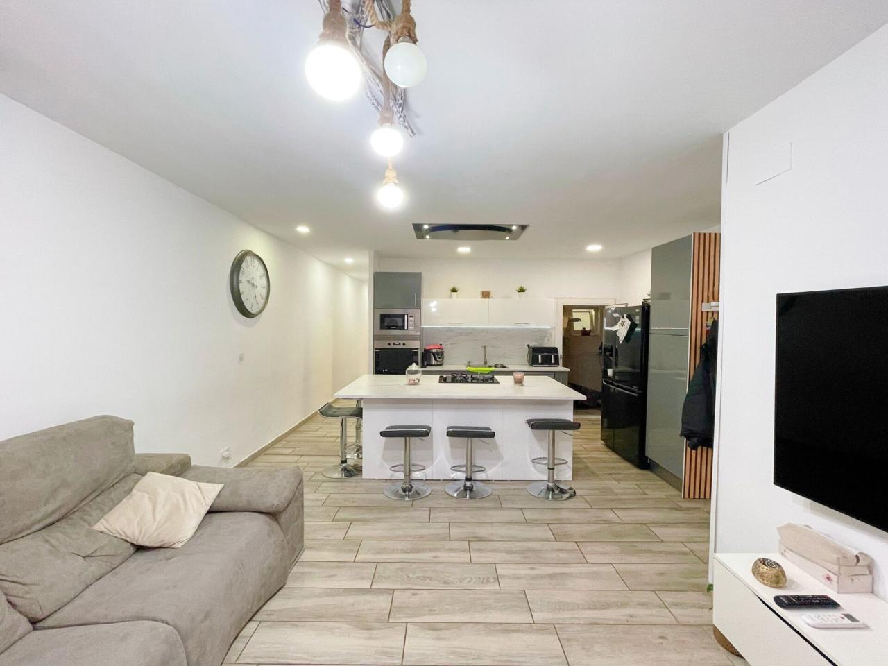 La vivienda dispone de un total de 98m2 construidos según catastro ( aparte la terraza privativa ) Completamente reformada, al entrar a la vivienda te recibe un precioso espacio diáfano donde conecta la cocina con el salón.
