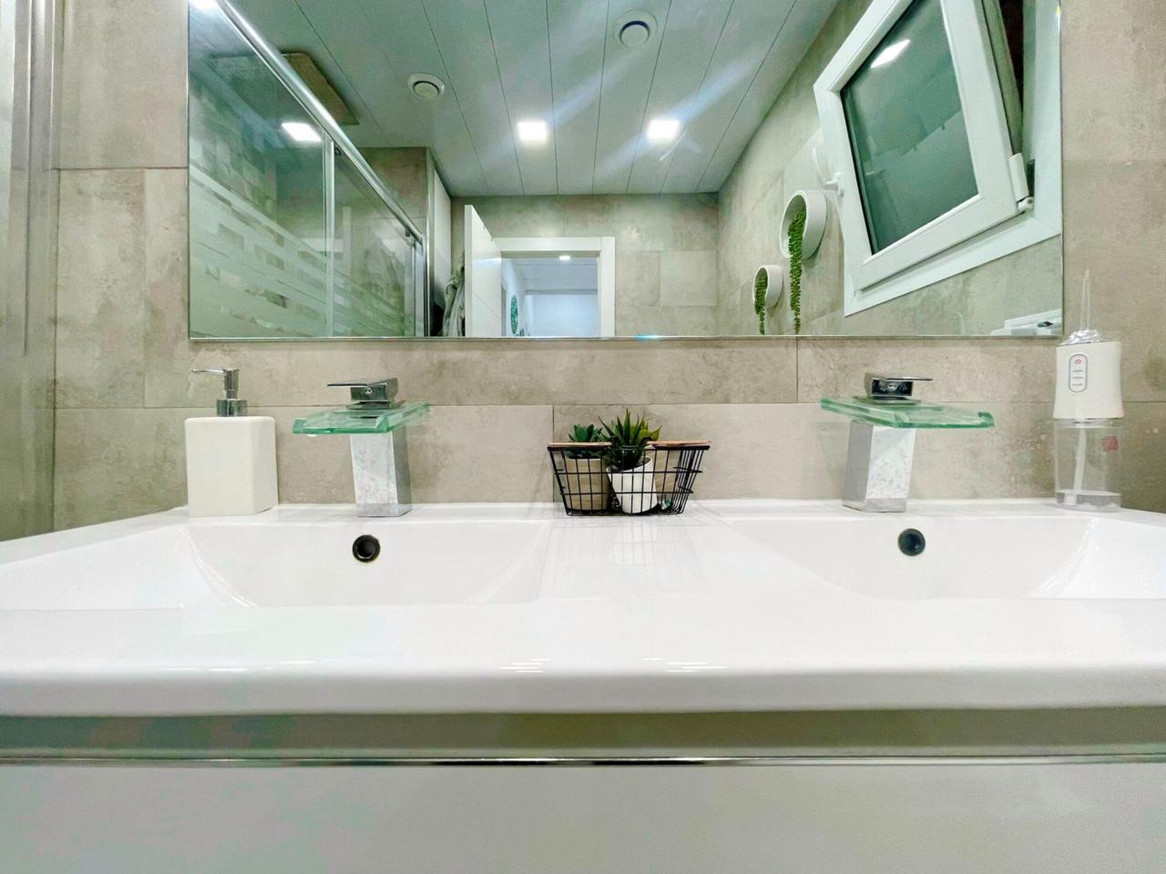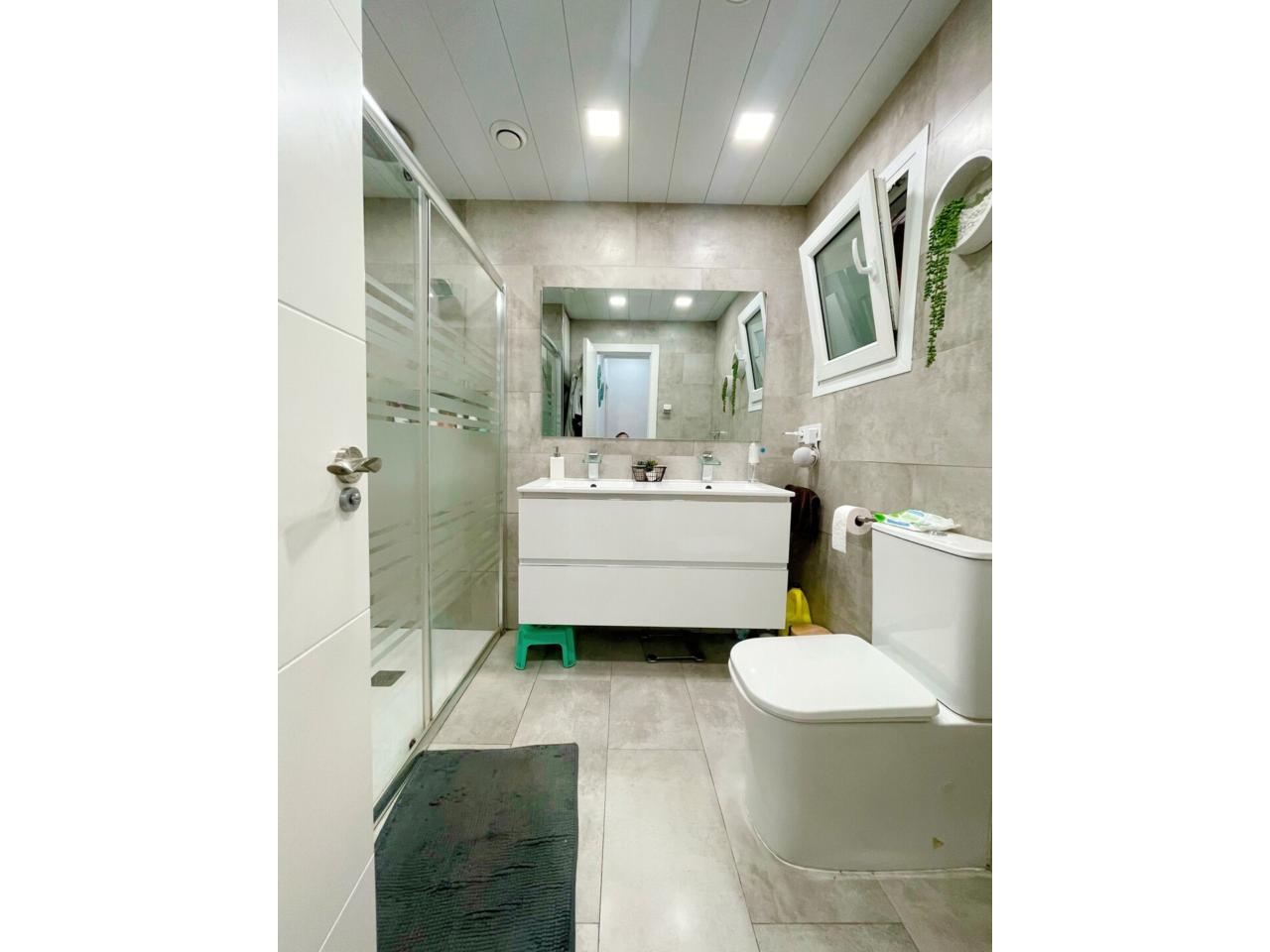 El cuarto de baño de generosas dimensiones dispone de 5 piezas, plato de ducha grande con mampara acristalada y Doble pica.