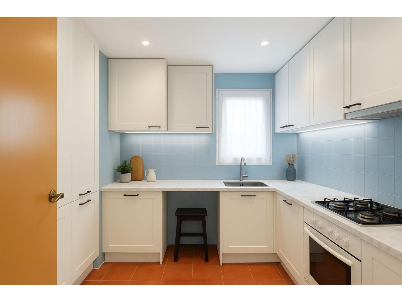 A través del pasillo todo exterior encontramos la cocina, cuadrada y equipada con armarios a 3 paredes.